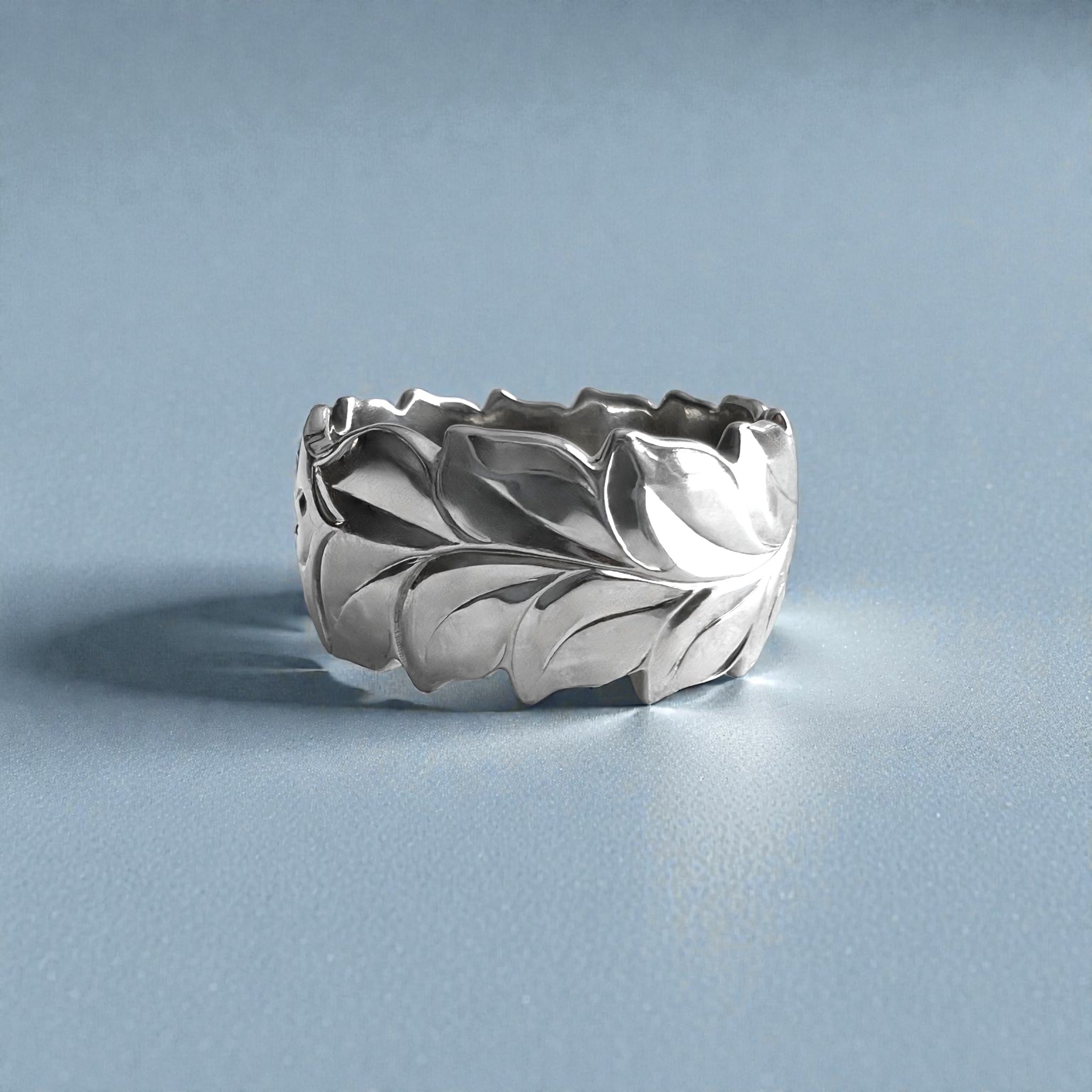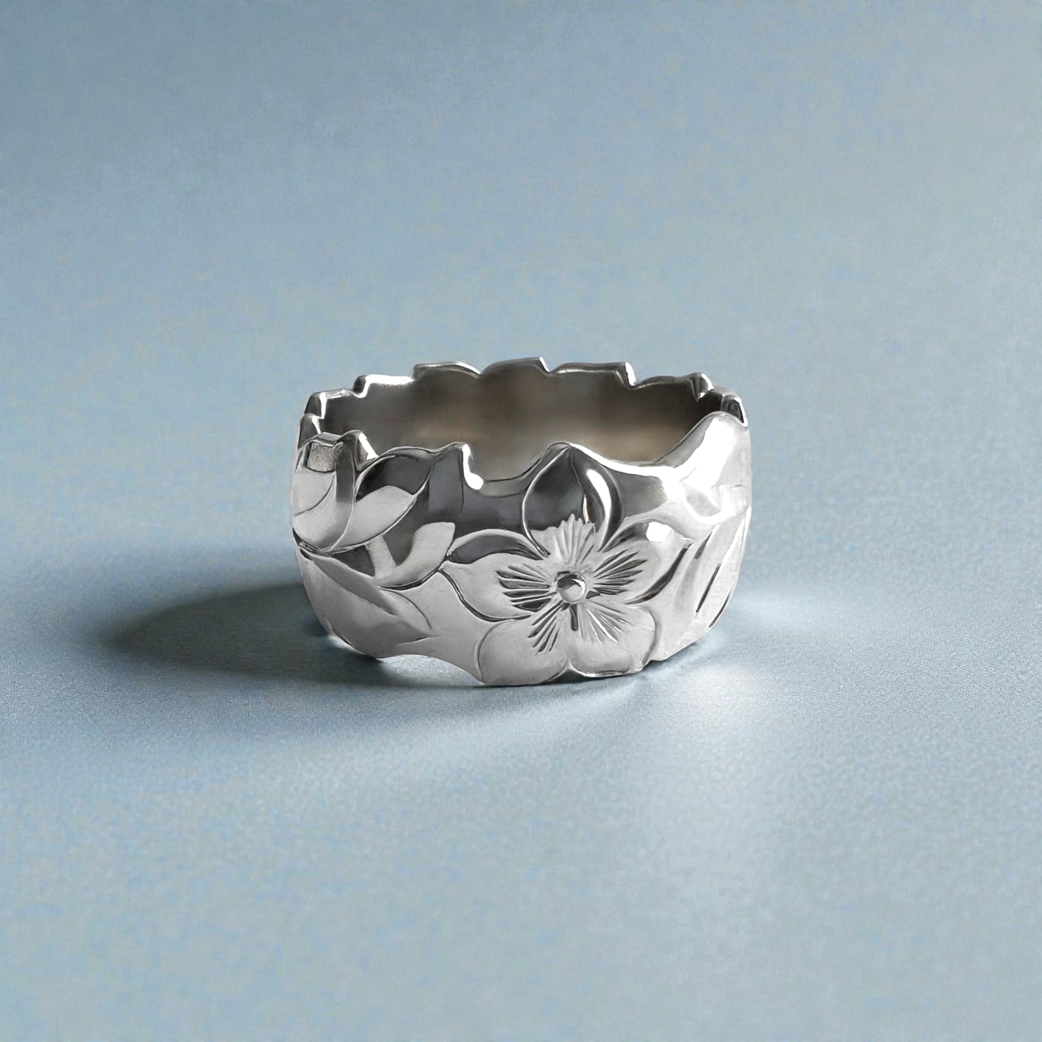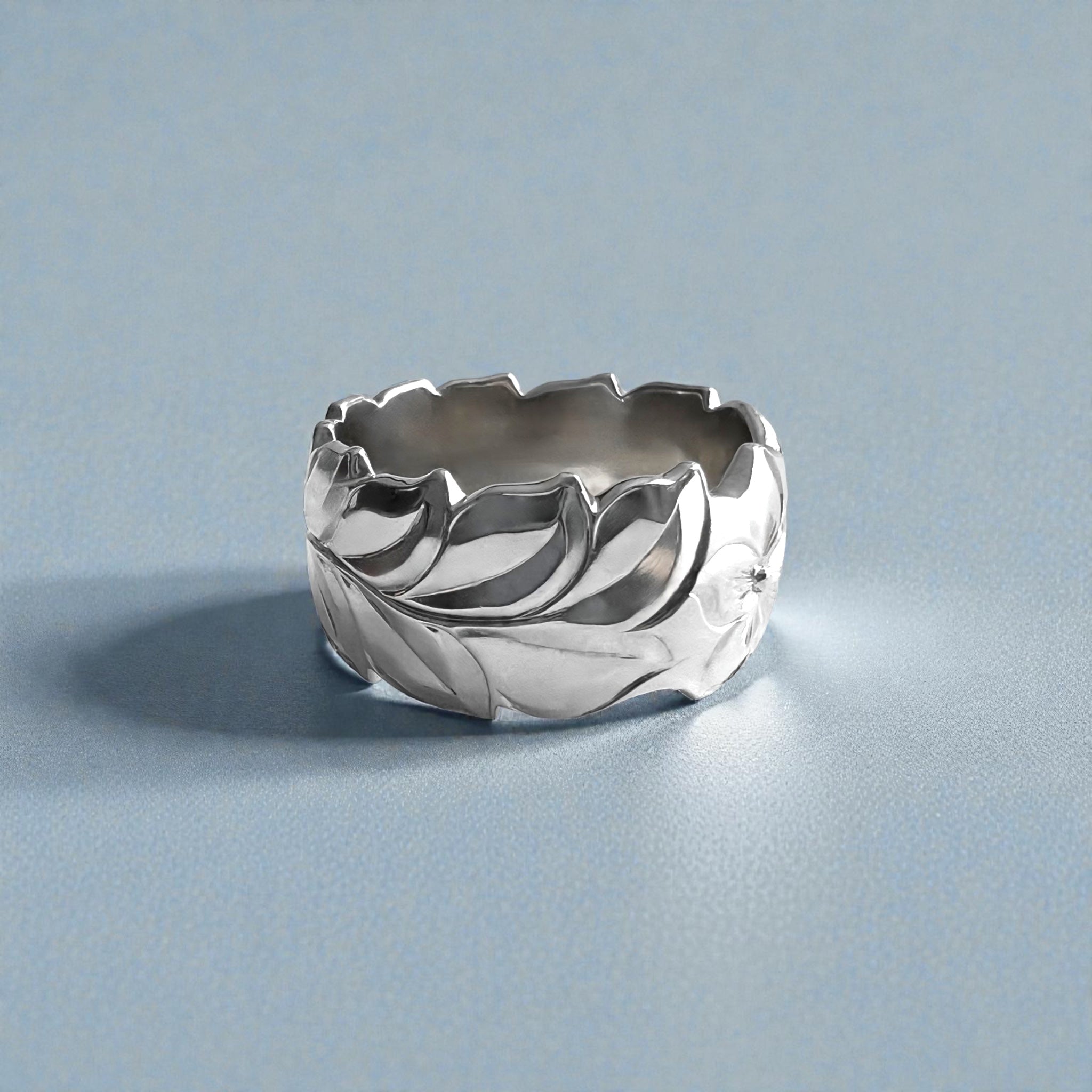Barrel, 12mm wide ring. Shiny Maile with 2x Hibiscus design. Scalloped border.