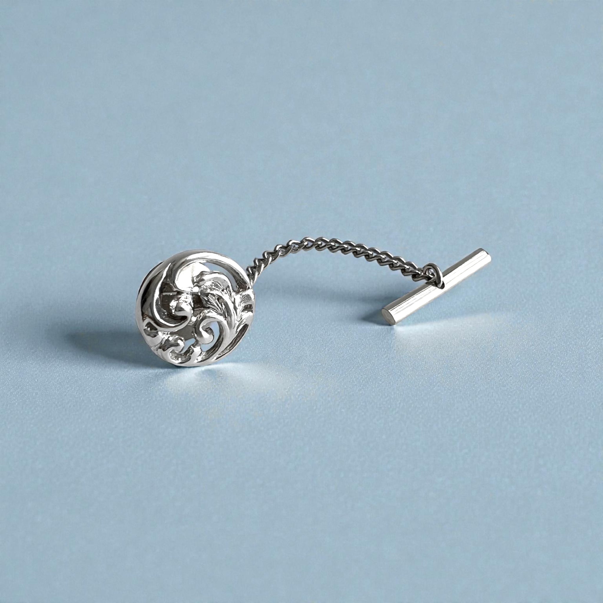 Filigree scroll Tie Tac with chain in 14K White Gold. Button hole catch and chain are made of base metal. Approximately 14mm.