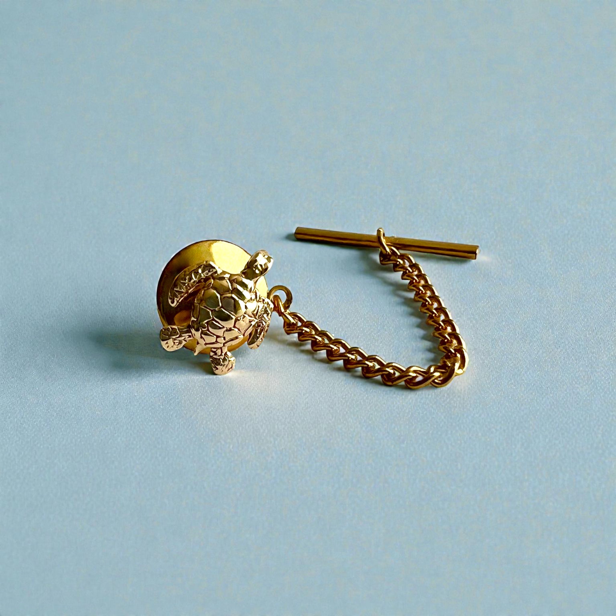 Turtle Tie Tac with chain in 14K Yellow Gold. Button hole catch and chain are made of base metal. Approximately 11.5mm long and 9.5mm wide.
