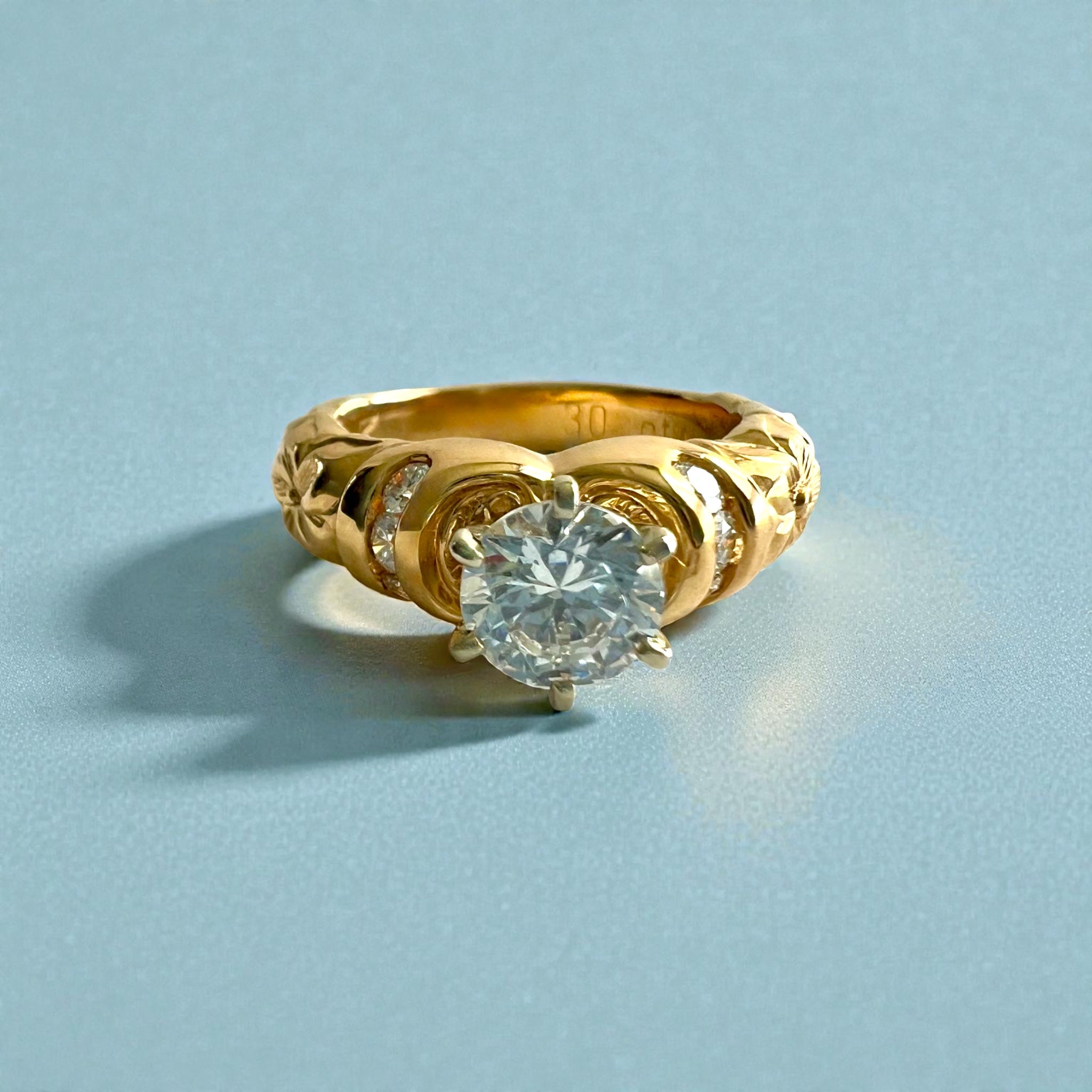 Tapered, approx 7mm (top), 4mm (bottom) barrel ring with 6.4mm Cubic Zirconia (the size of Cubic Zirconia corresponds to approx. 1ct Diamond) and 6x .05ct (.30ctw) channel style set Diamonds. Two engraved Hibiscus flowers (four in total) on each side. Scalloped at the top.