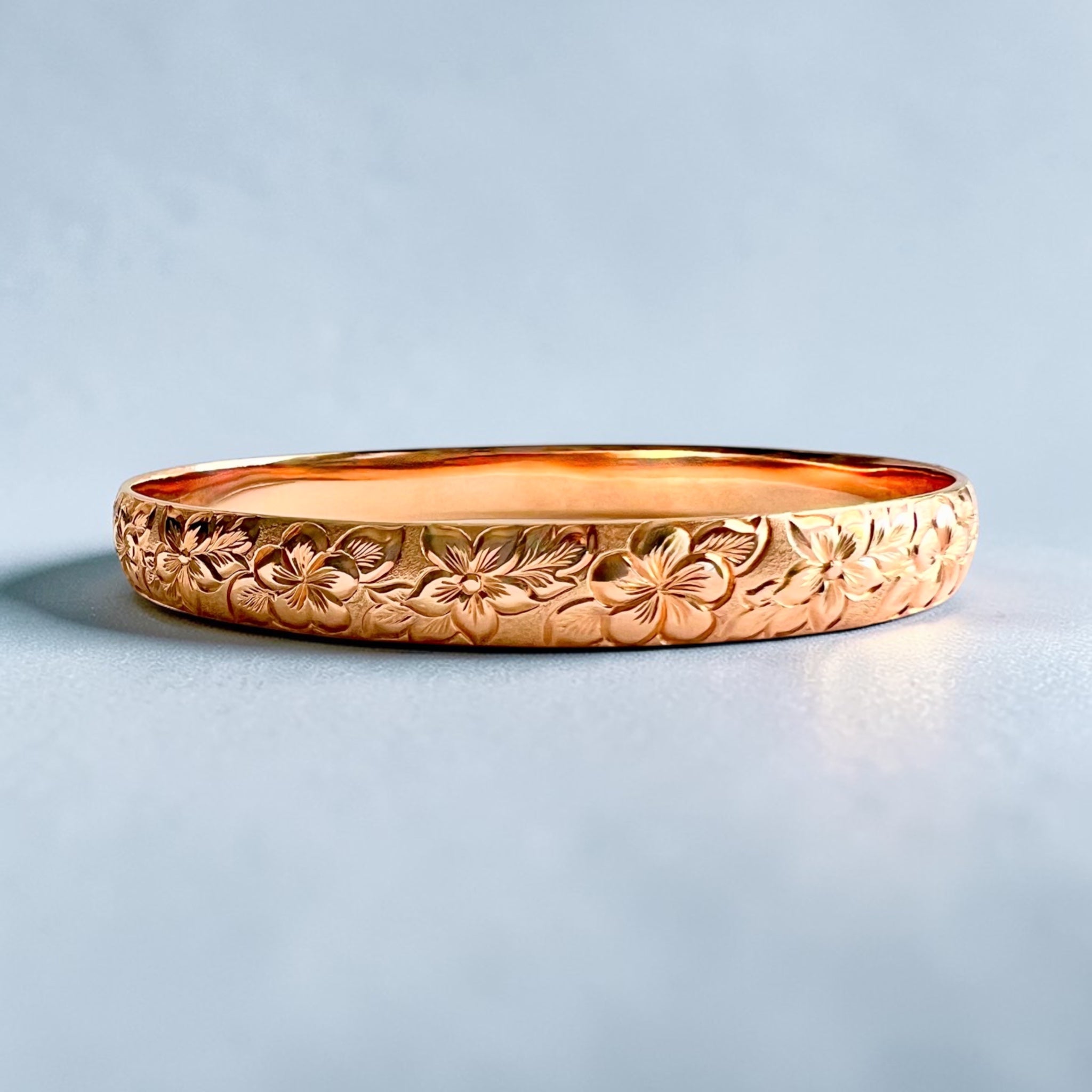 Hibiscus & Plumeria with Leaves 8mm Bangle Bracelet in 14K Pink Gold in size 7 5/8