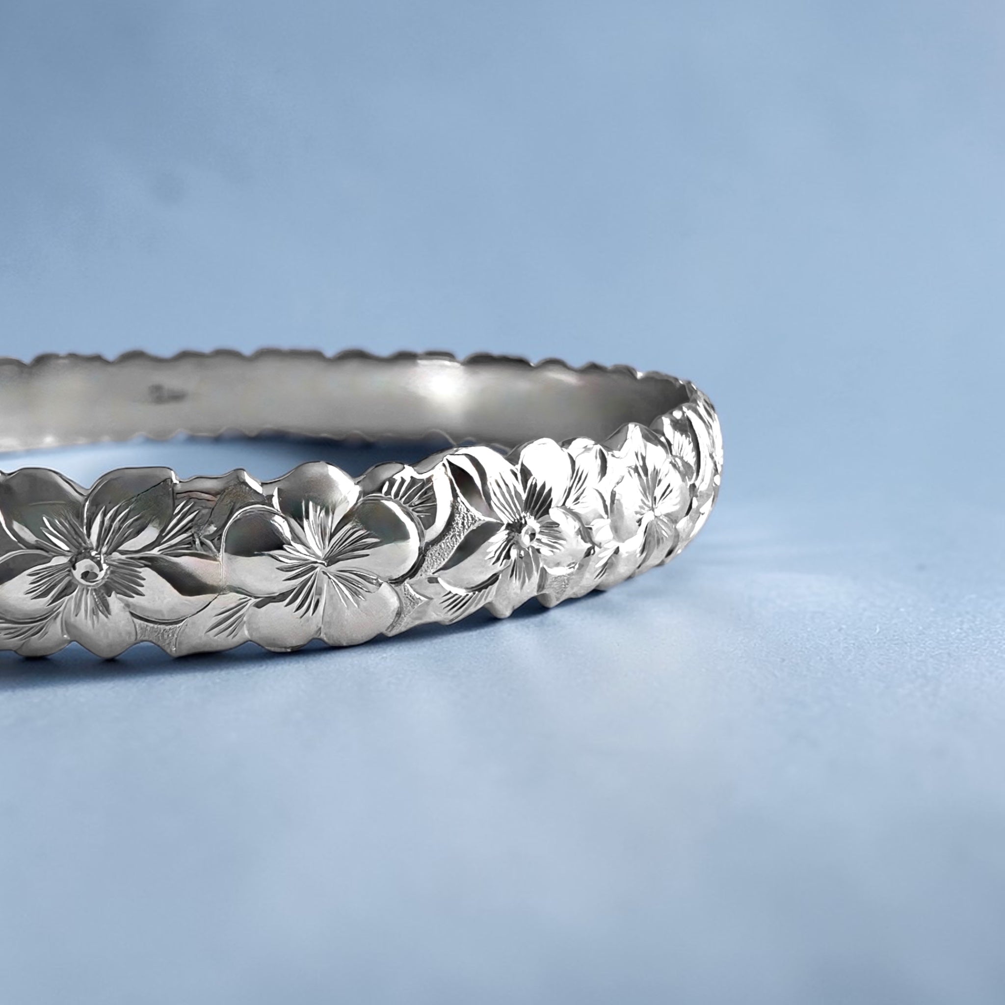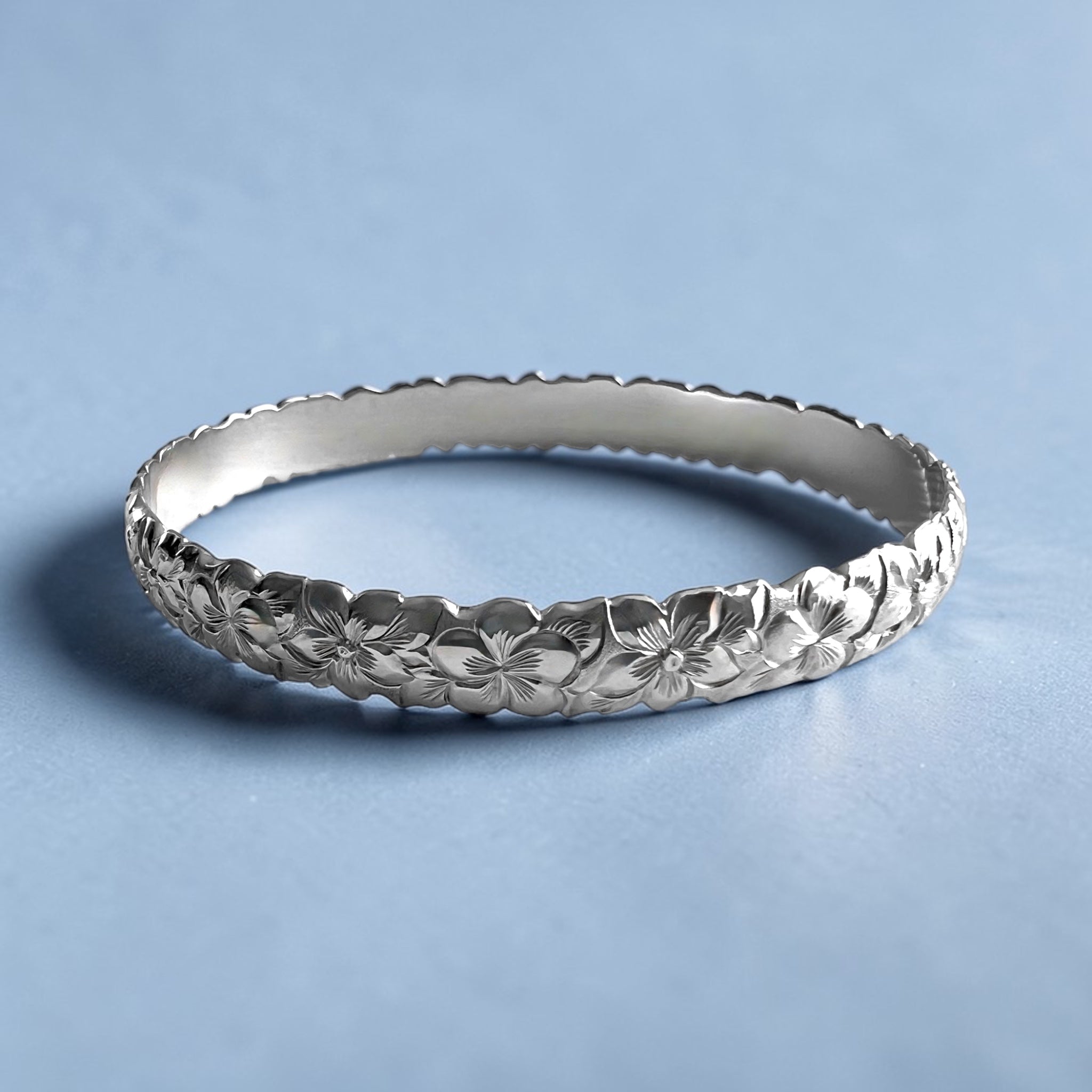 Scalloped Hibiscus & Plumeria with Leaves 8mm Bangle Bracelet in 14K White Gold in size 7