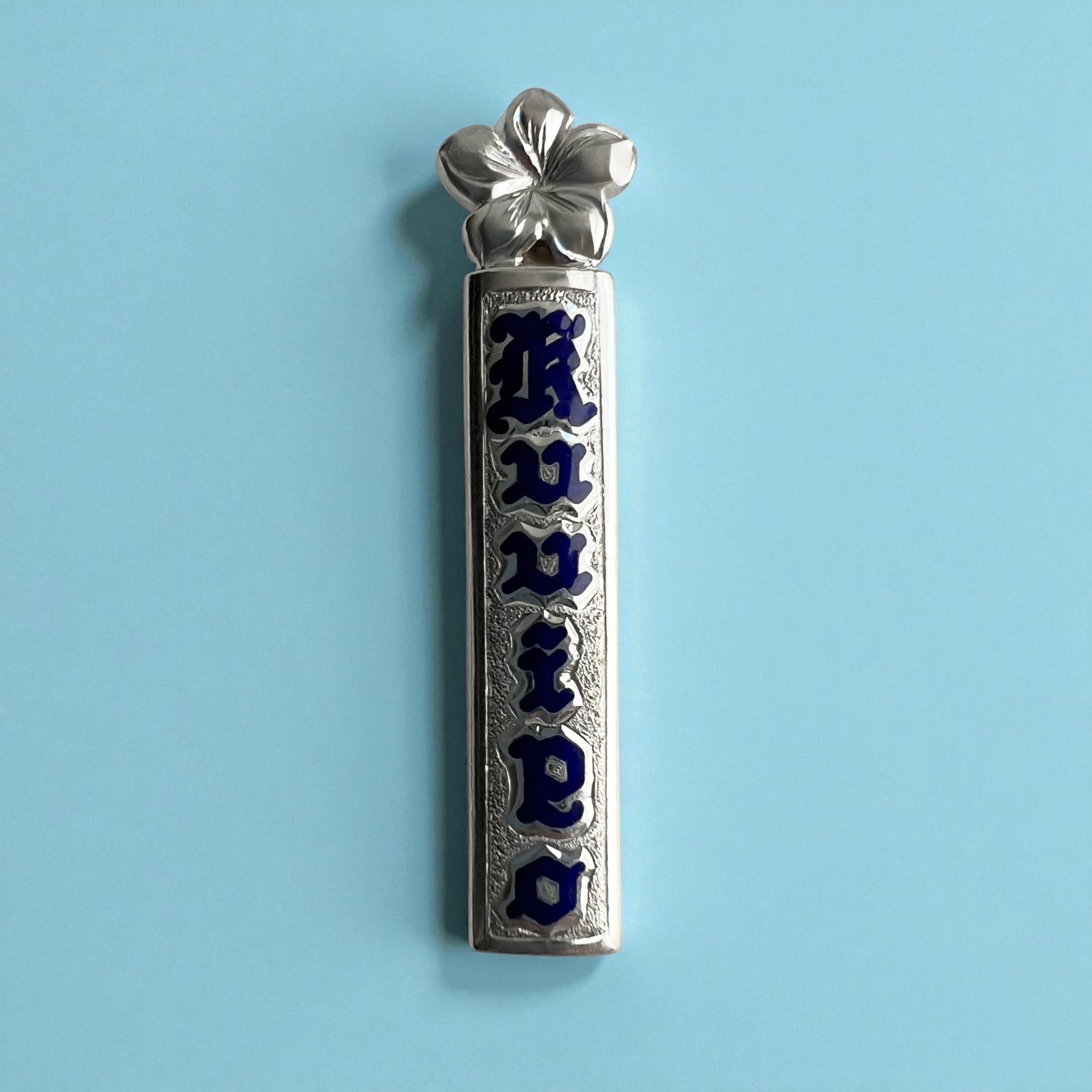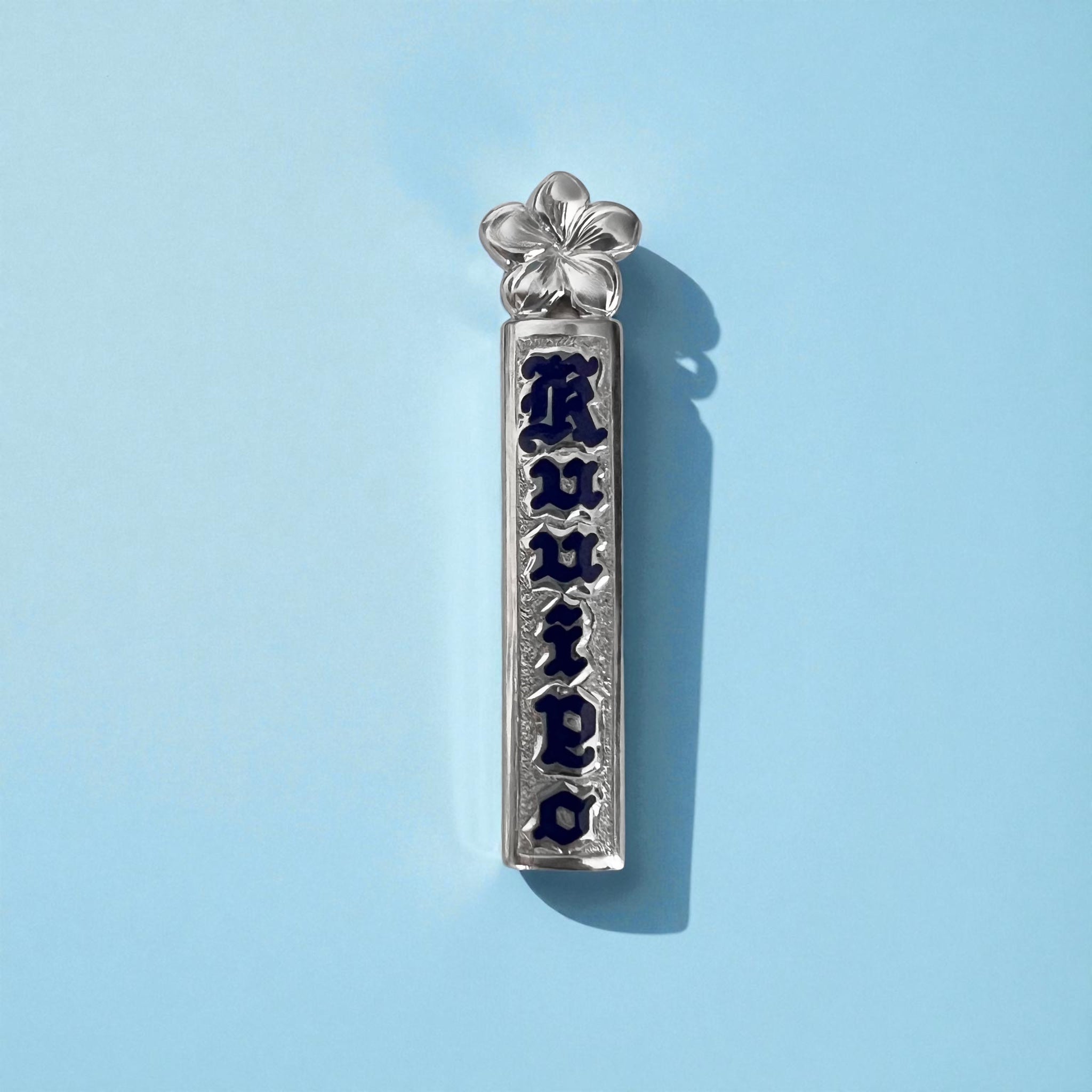 Plumeria on top pendant with "Kuuipo" ("Sweetheart" in Hawaiian) in signature cobalt blue enamel on polka dot background. Approx. 6mm x 1" in length (measured without the flower). Plain border. Plain on the back.