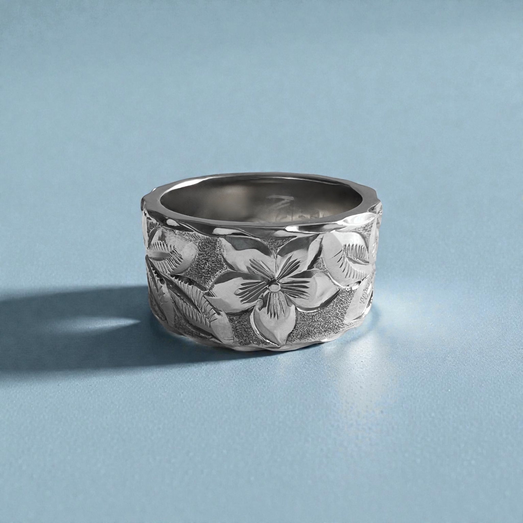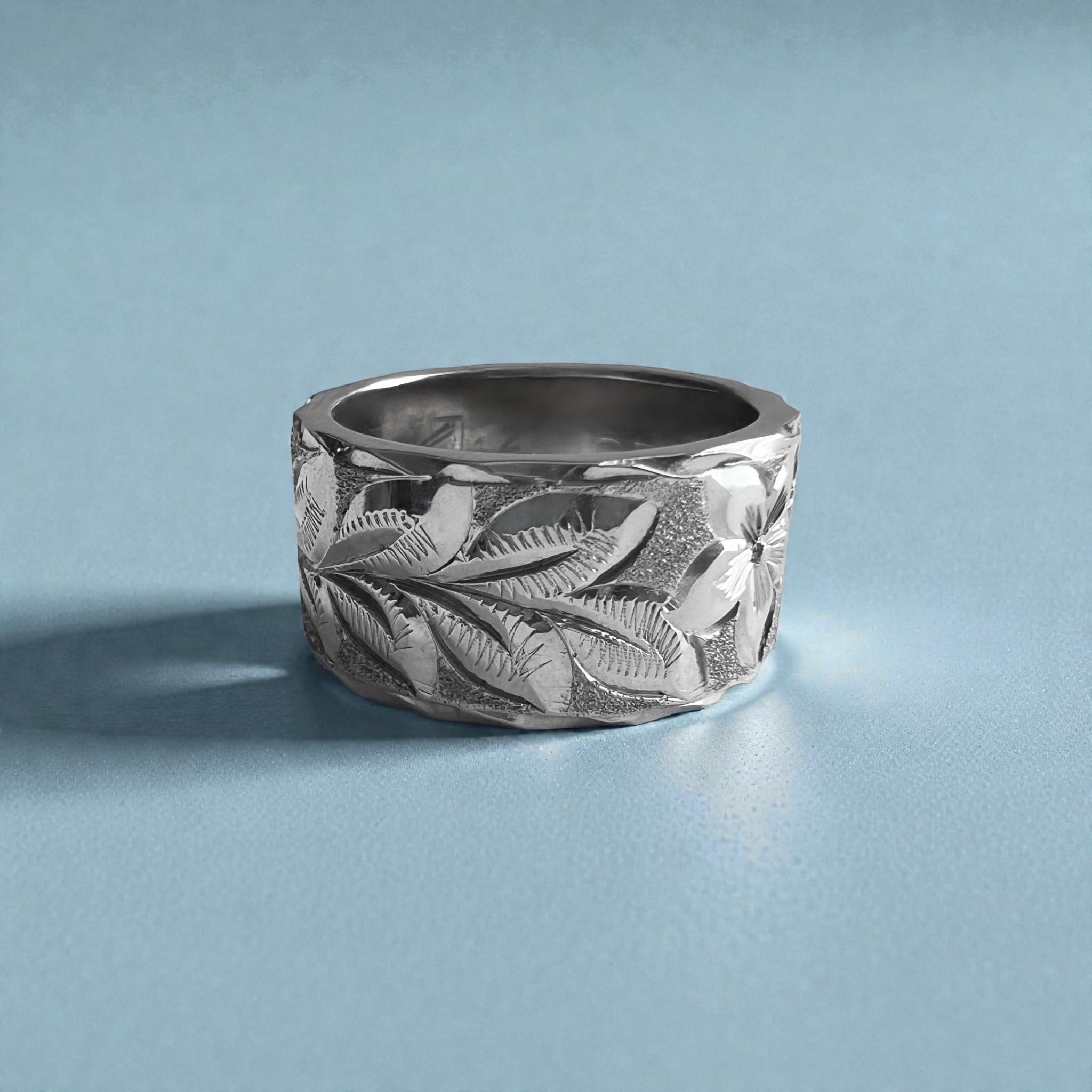 Flat, 10mm wide ring. Maile and 2x Hibiscus design with 1x .05ct Diamond. Rope border.