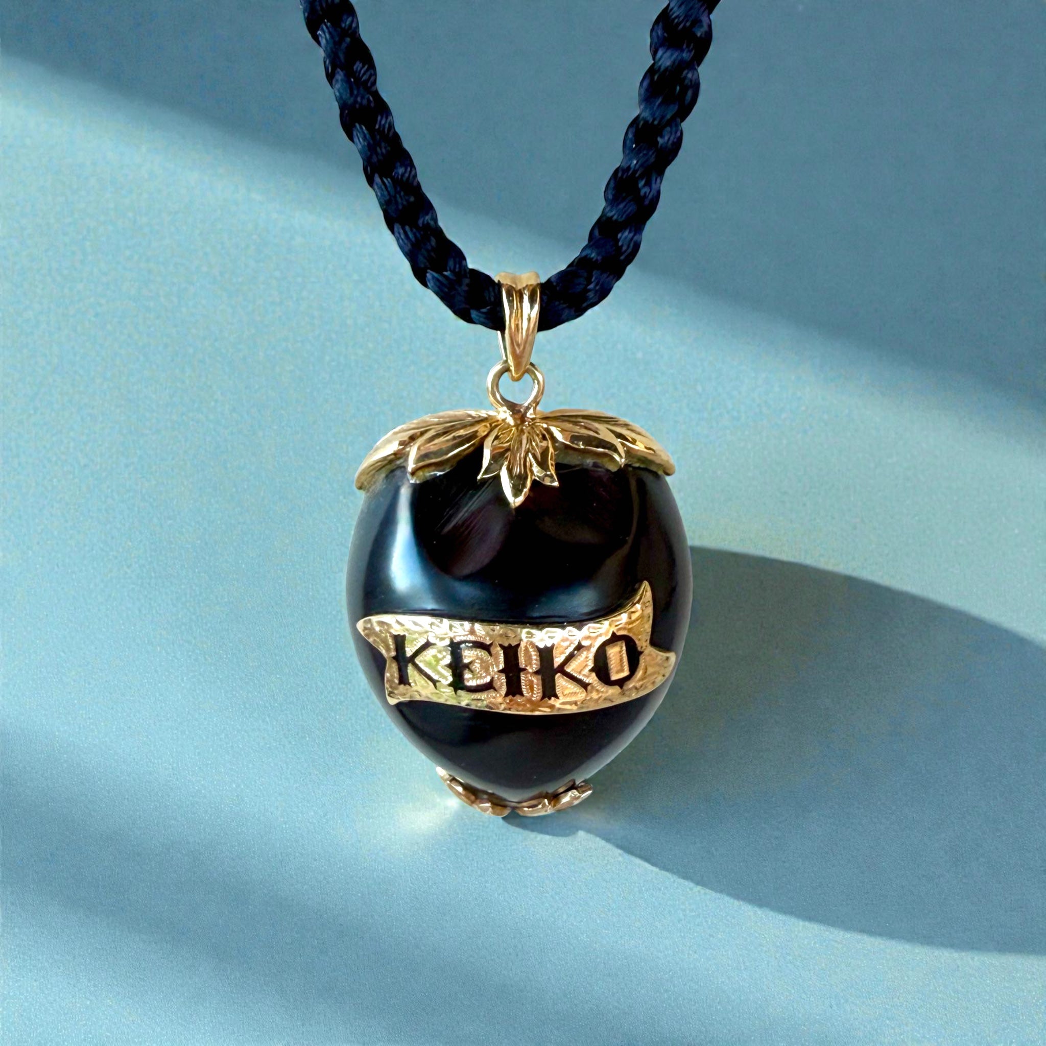 Hawaii's last reigning Monarch, Queen Liliuokalani, wore this sacred nut as a pendant encrusted with a 14K gold nameplate and attachments. We have replicated this stunning local favorite with modernized touches. It is skillfully constructed by our master craftsmen in 14K gold with enameled nameplate, attachments and hand engraving. Queen Liliuokalani's pendant looks as beautiful as ever one hundred years after she wore it.