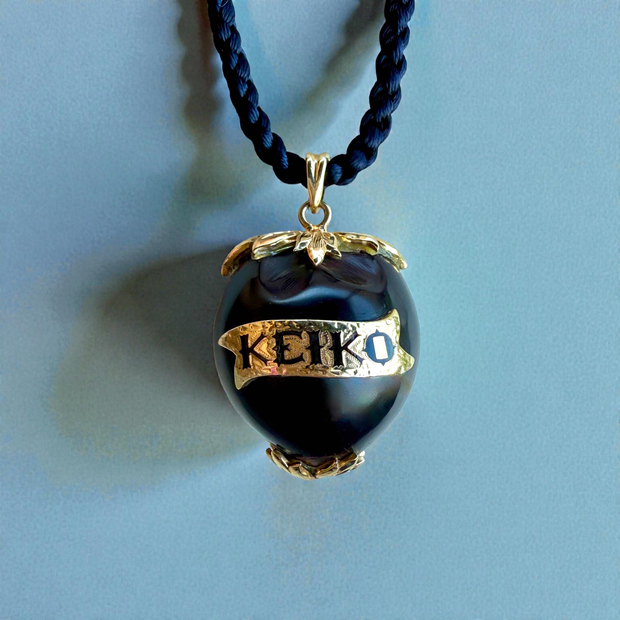 Kukui Nut Pendant with "Keiko" in 14K Yellow Gold. Approximately 23.7mm wide. 18" braided cord included.
