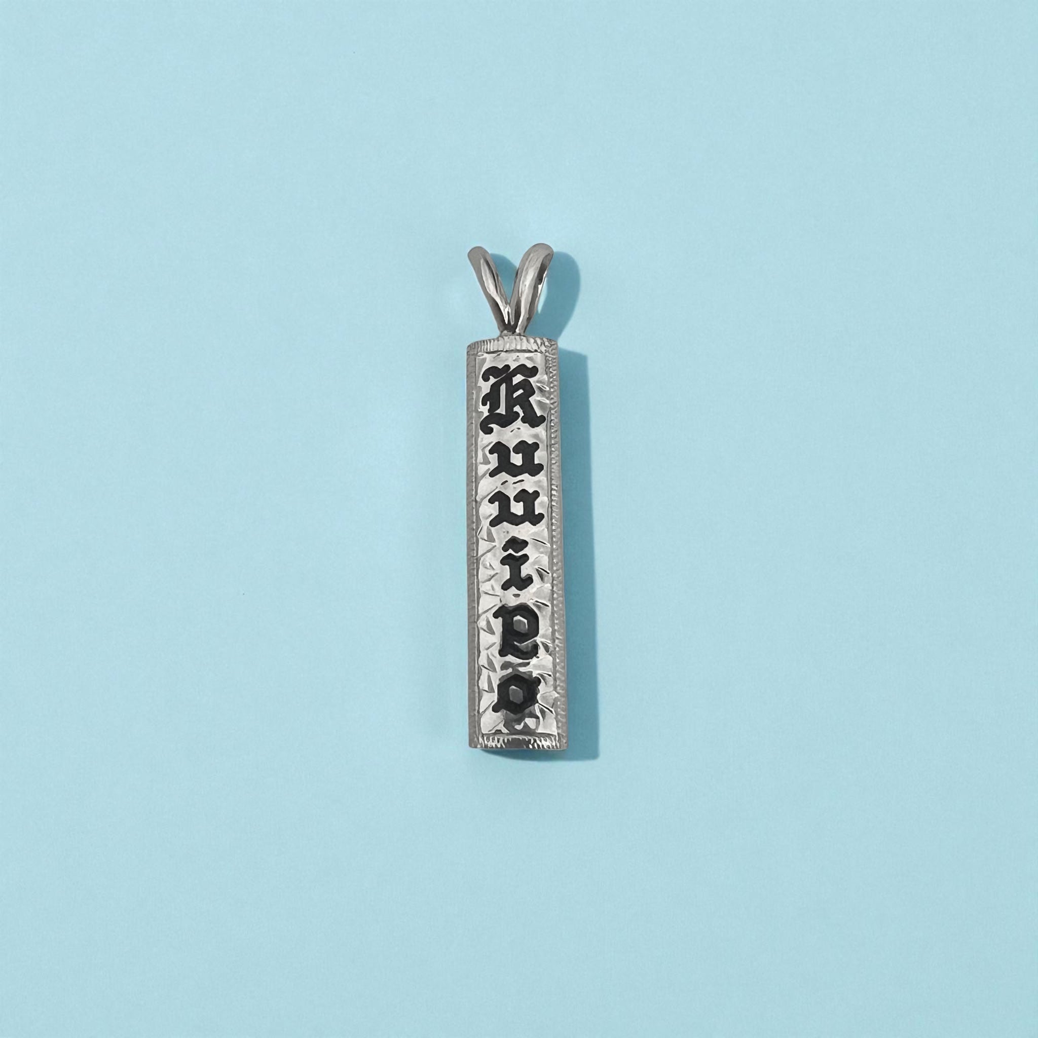 "Kuuipo" ("Sweetheart" in Hawaiian) pendant in traditional black enamel on chip chop background. Approx. 6mm x 1" in length. Wriggle border. Plain on the back.