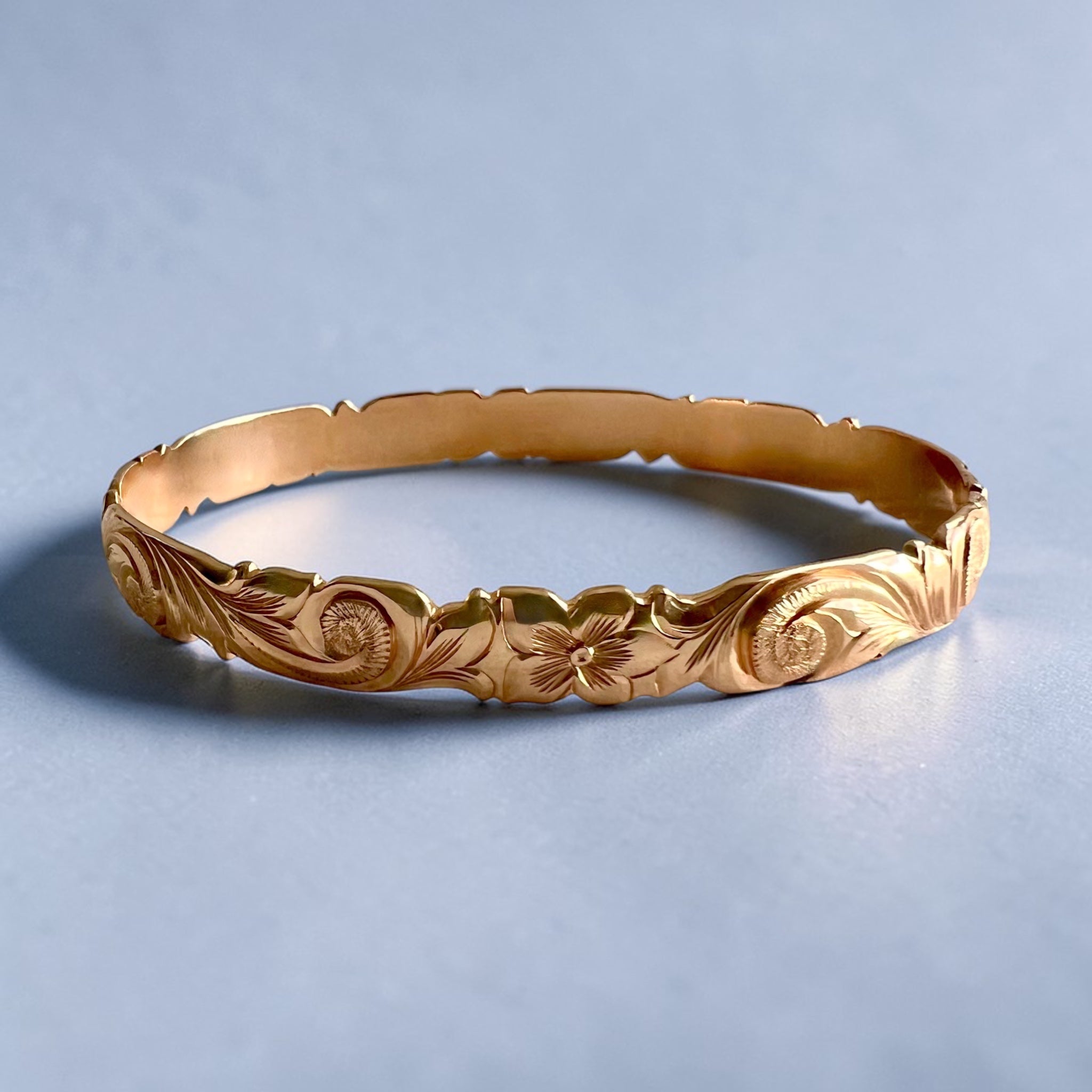Scalloped Old English & 2x Hibiscus 8mm Makana Bangle Bracelet in 14K Pink Gold