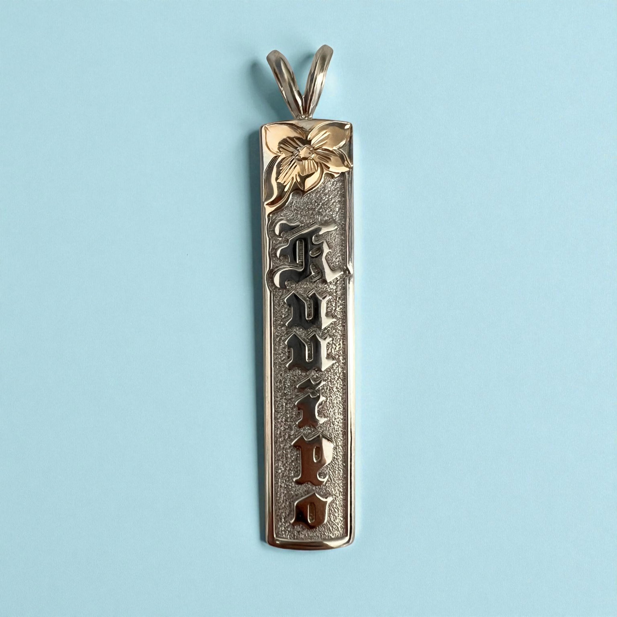 Two-Tone Flower on Top Raised "Kuuipo" 8mm x 1 1/2" Pendant in 14K Gold