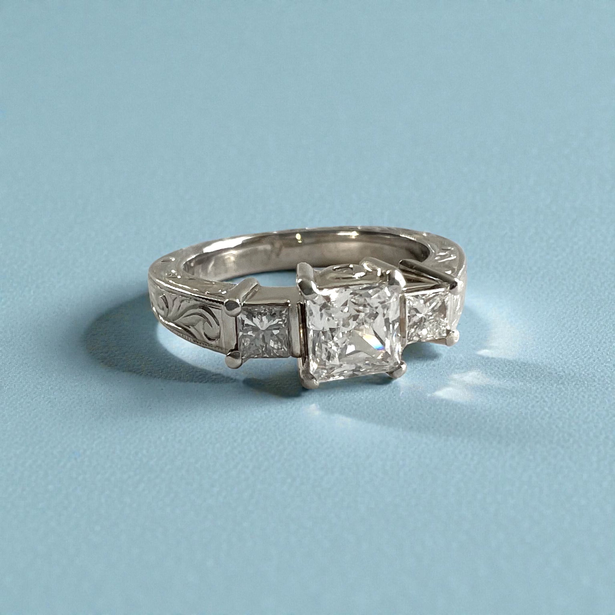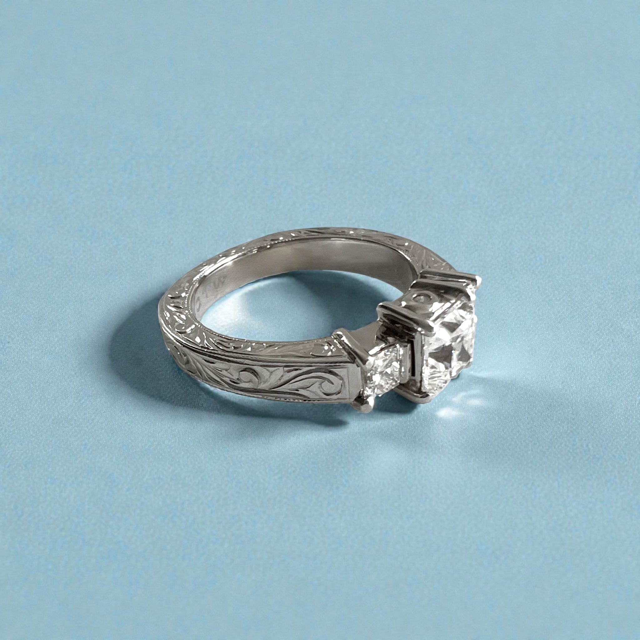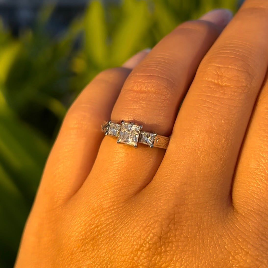 Flat, approximately 3mm band, slightly tapered. Old English design with Princess cut, approximately 5mm x 5mm Cubic Zirconia, 2 x .15ct Princess cut Diamonds and 2x .02ct round Diamonds.