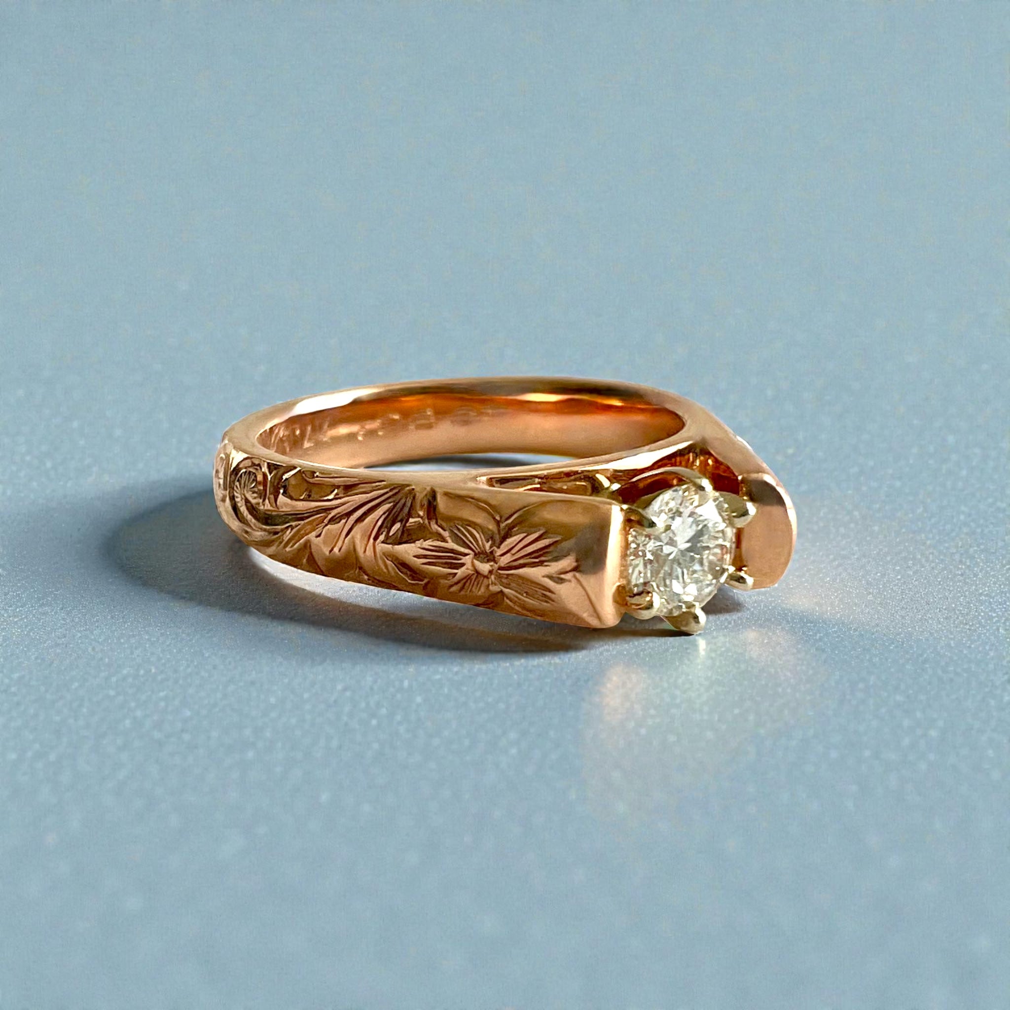 Old English & Hibiscus 4mm French Mount Solitaire Ring w/ .28ct Diamond in 14K Pink Gold