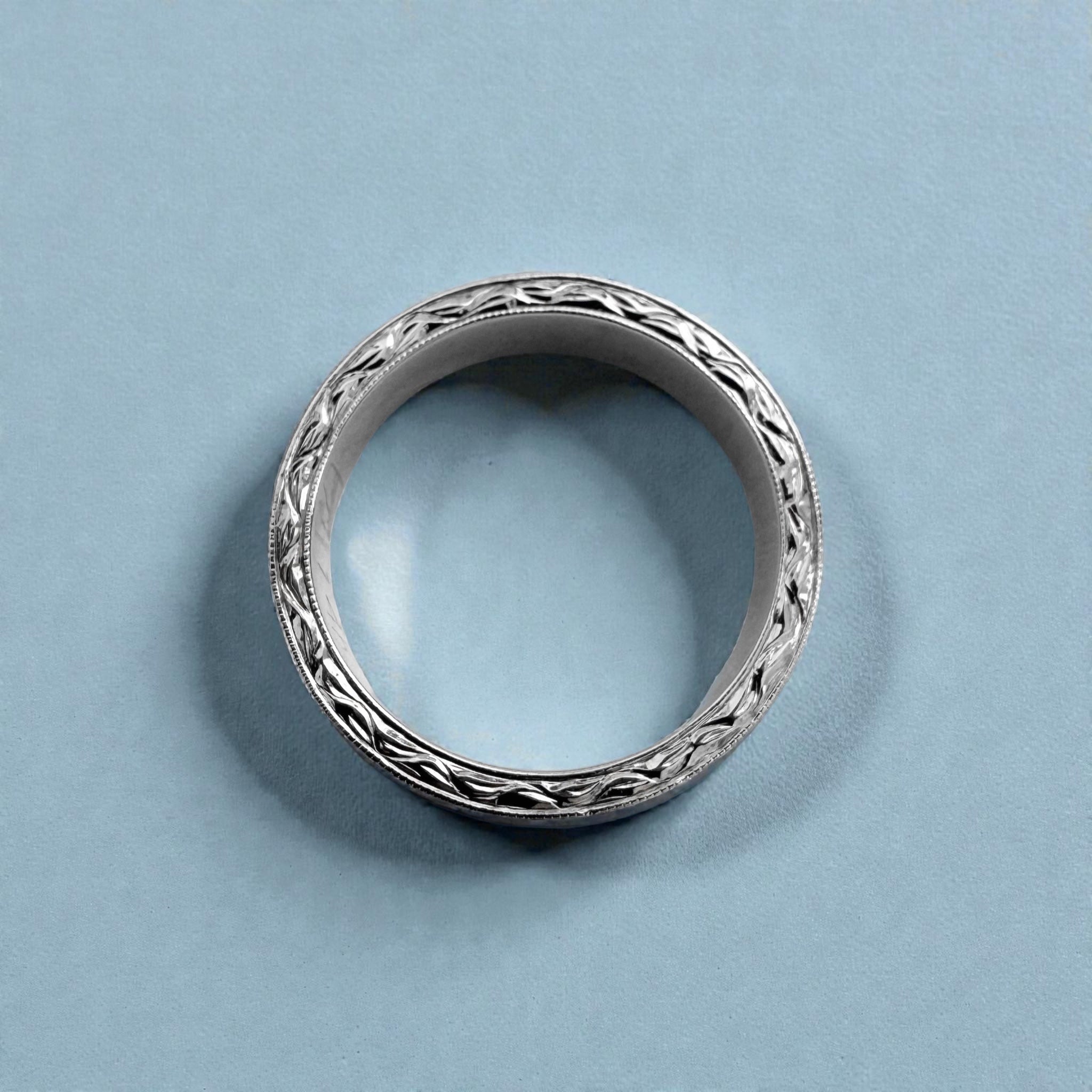 Milgrain Border Shiny Maile, Hibiscus & Plumeria 4mm Flat Ring in 14K White Gold