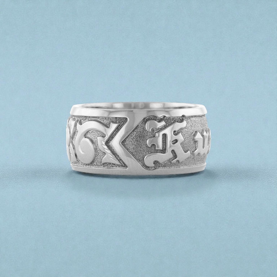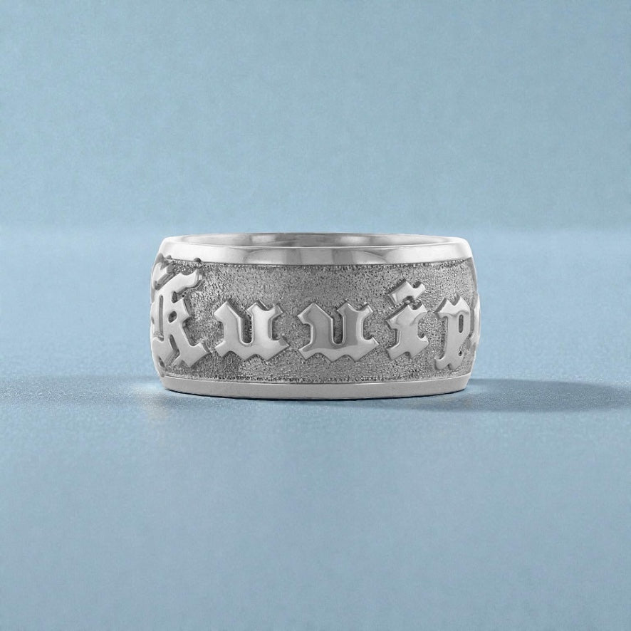 Raised Old English and Plumeria 10mm "Kuuipo" Ring in 14K White Gold