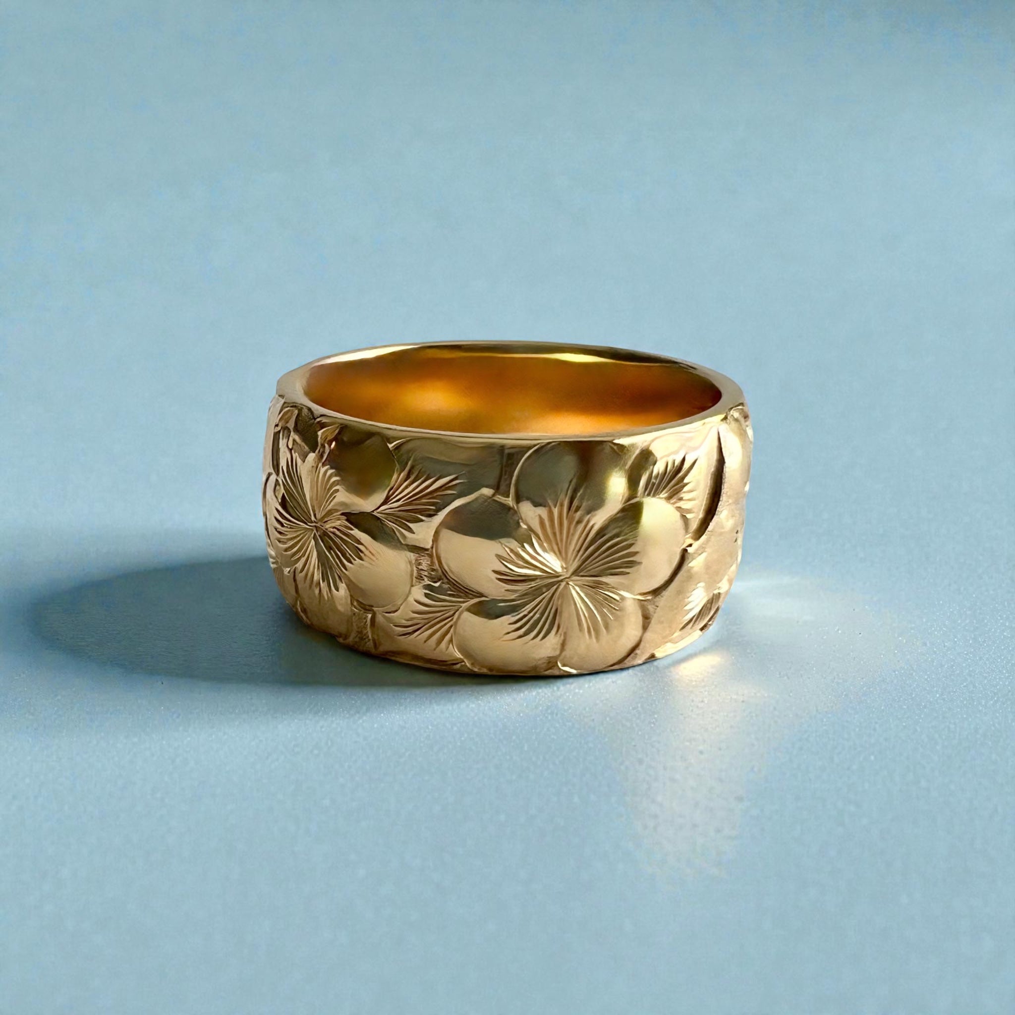 Plumeria w/ Leaves All Around 10mm Ring in 14K Yellow Gold